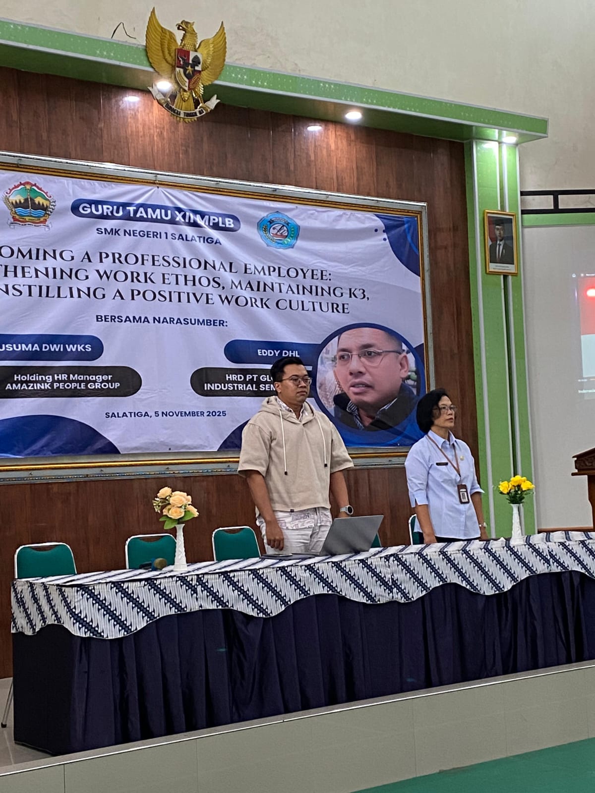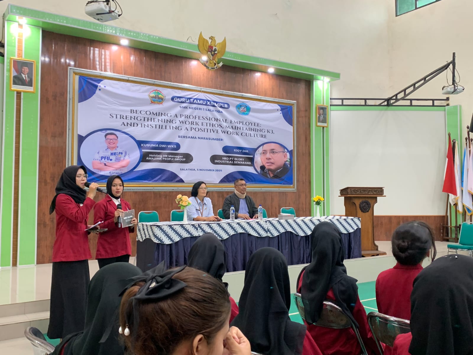 Pada Rabu, 5 November 2025, SMK Negeri 1 Salatiga kembali melaksanakan kegiatan pembelajaran yang inspiratif melalui program guru tamu bagi siswa kelas XI jurusan Manajemen Perkantoran dan Layanan Bisnis (MPLB). Kegiatan ini menghadirkan dua narasumber profesional dari dunia industri, yaitu Bapak Kusuma Dwi WKS, Holding HR Manager AMAZINK PEOPLE GROUP, dan Bapak Eddy DHL, HRD PT Glory Industrial Semarang.